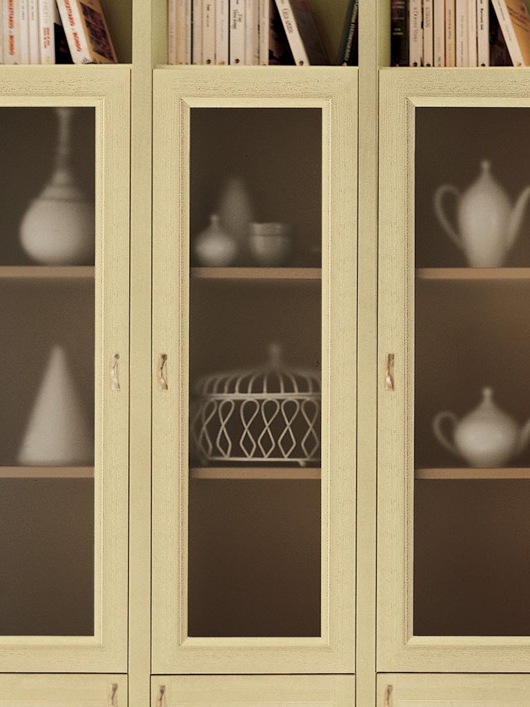 La parete a spalla, racchiusa tra i fianchi e rifinita con cappello con frontale, dispone di ante in legno, vetro e vetro inglesina, cassetti e cassettoni e ripiani.