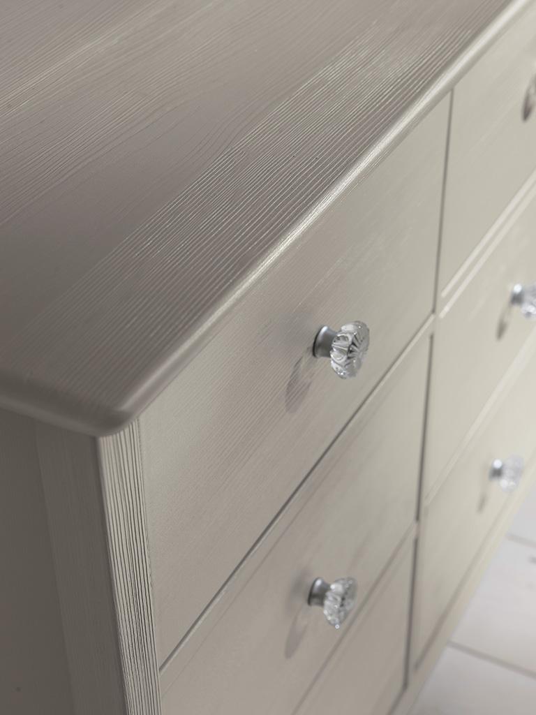 Struttura in multistrato impiallacciato abete con schienali in particelle di legno spessore 8 mm. Cassettoni con telaio in abete massello con pannello in multistrato di pioppo impiallacciato abete. Struttura del cassetto in multistrato di betulla spessore 15 mm e fondo in compensato. Guide quadro ad estrazione totale. Profondità 520 mm. Rifinibile con cimasa superiore.