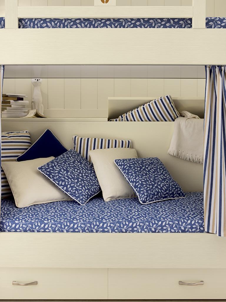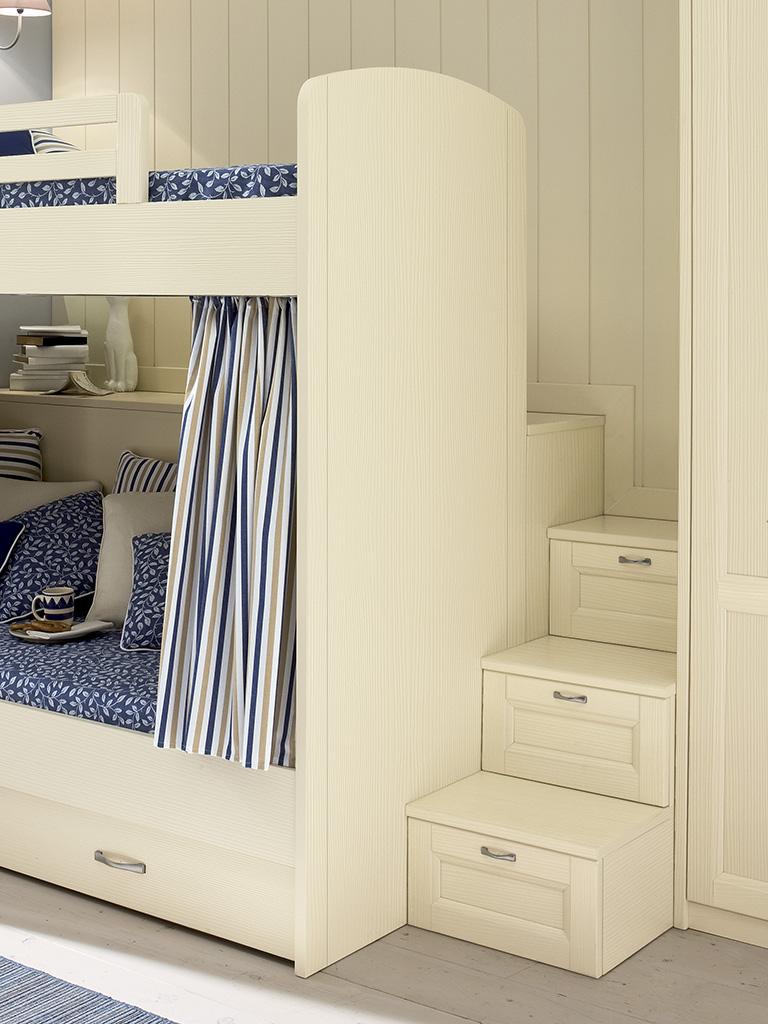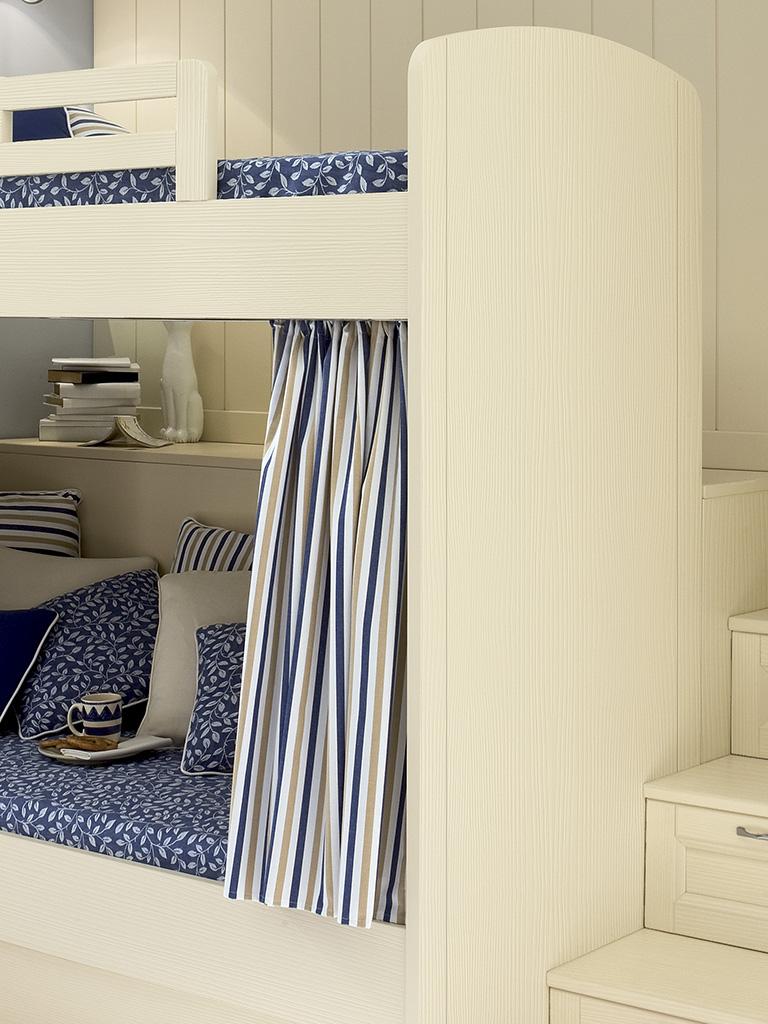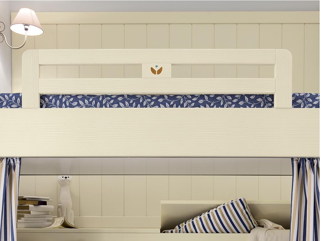 Letto a castello completo di protezione removibile in legno spazzolato panna con tendine in tessuto 55 e copriletto in tessuto 53.