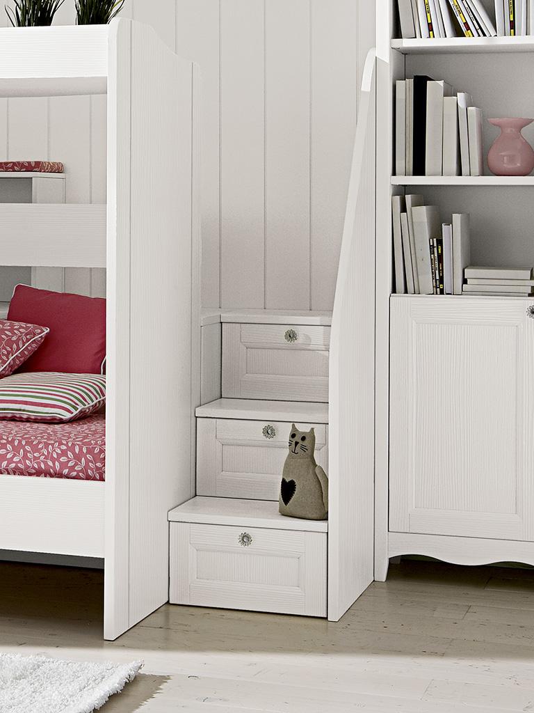 Pannello in listellare di abete impiallacciato spessore 25 mm per i fianchi soppalco, longoni letto e il piano scrittoio. La composizione comprende anche la scala a tre elementi e il corridoio per soppalco.