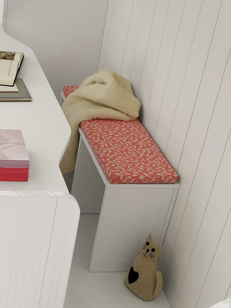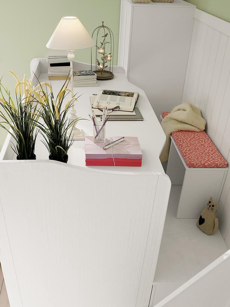 Finitura dei mobili in bianco neve spazzolato, copriletto e cuscino panchetta in tessuto 50 e poltroncina in tessuto 49.