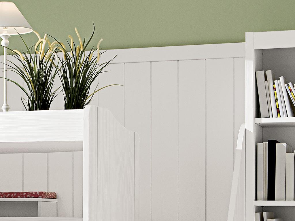 L'armadio componibile con zoccolo, la boiserie a doghe verticali e la parete a spalla componibile con anta e vano giorno fanno da sfondo al soppalco con letto inferiore e scrittoio superiore.