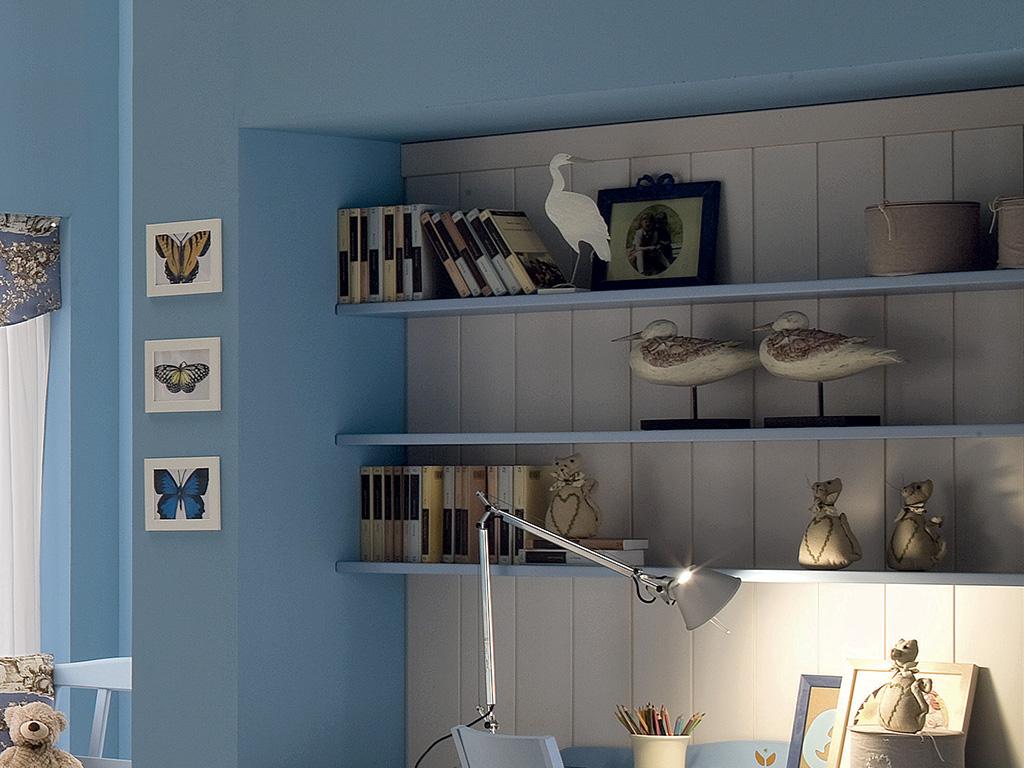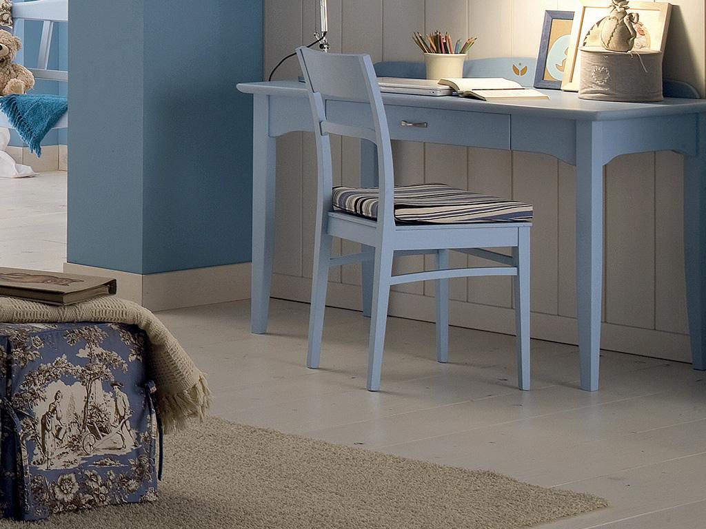 Angolo studio completo di mensole e tavolo scrittoio con cassettino, comoda seduta sulla sedia Alice con cuscino imbottito Racconti.