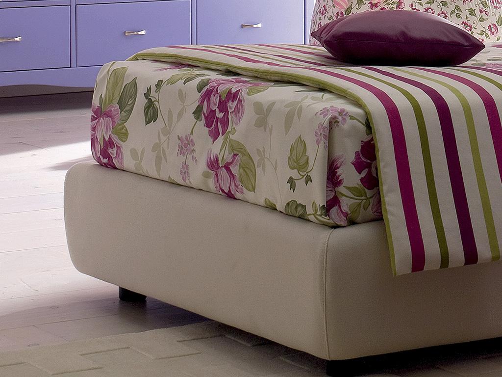 Letto imbottito disponibile nei tessuti Valplana. Disponibile anche con contenitore alzabile da pediera e meccanismo Pratik con alzaletto.