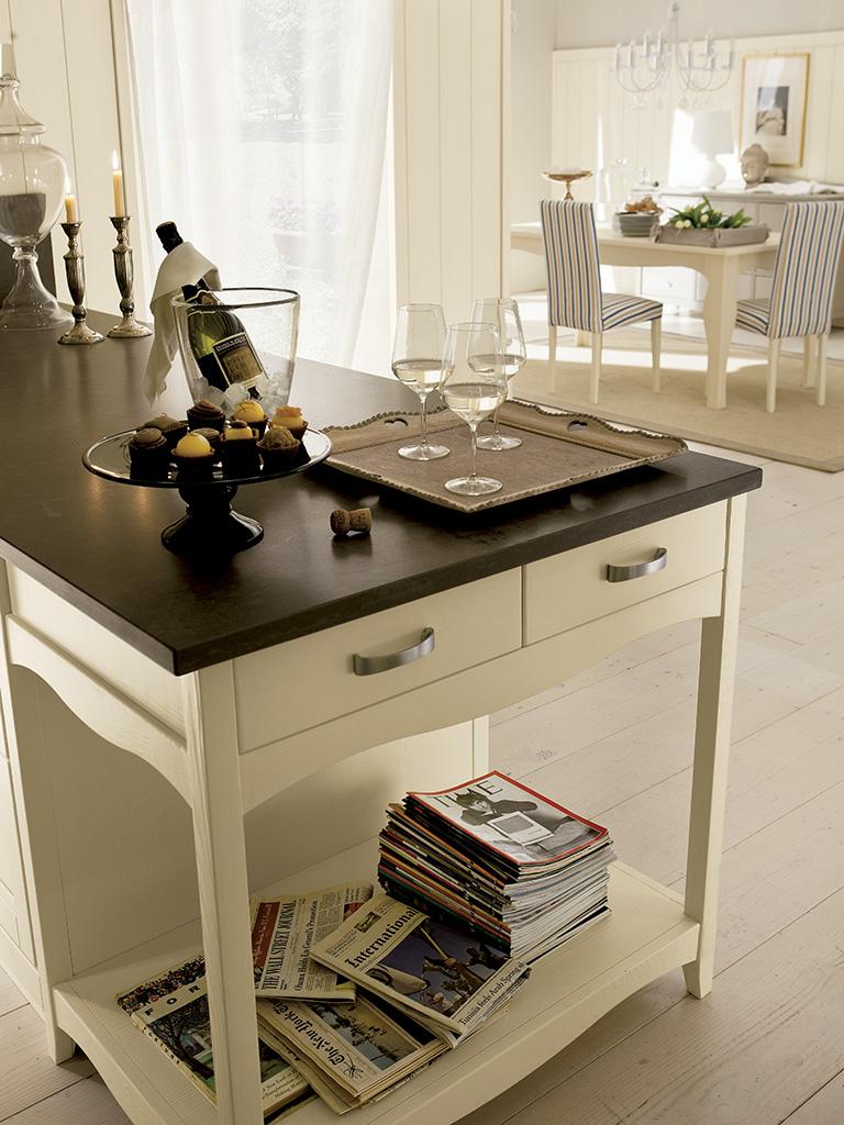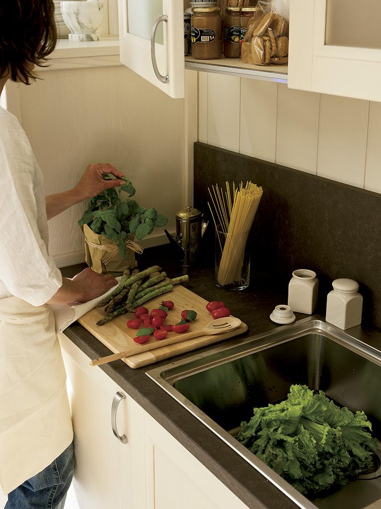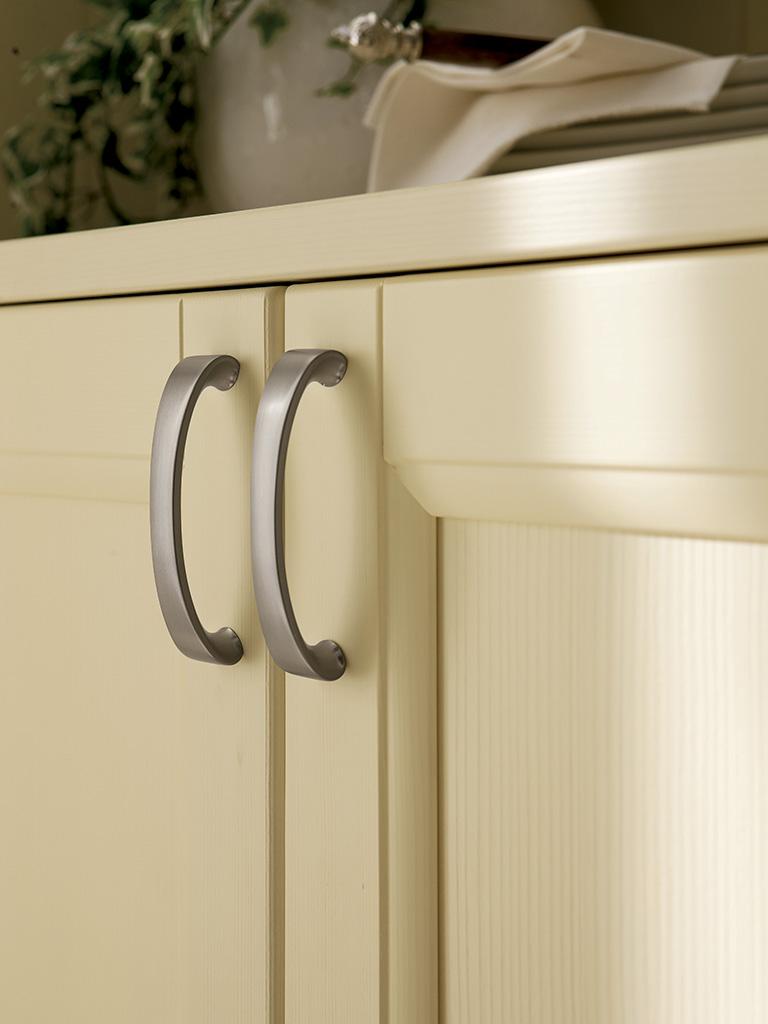 Il lavello in acciaio inox con miscelatore Rio cromato, risaltano per la loro modernità. I Frontali con telaio in legno massello finitura laccato crema spazzolato, si aprono con la maniglia Mary in inox satinato.