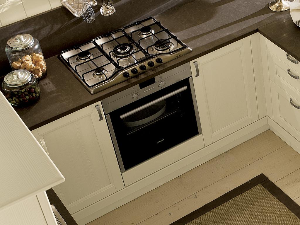 Pensili a vetro, cappa con massello sagomato, mensole, basi e colonne diversamente attrezzate, si possono disporre in svariati schemi per composizioni funzionali e personalizzate.