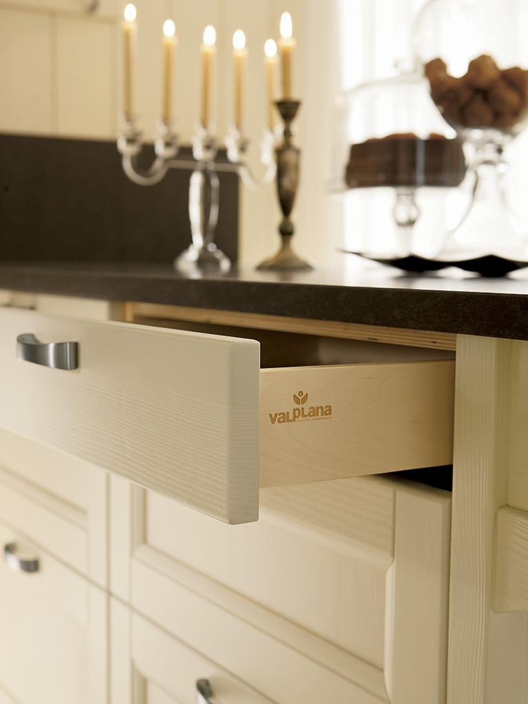 Base con struttura in multistrato spessore 18 mm con profondità 582 mm, con frontale casseto e cestoni in legno con telaio in abete massello e pannello in multistrato di pioppo impiallacciato abete spessore 22 mm, struttura in multistrato di betulla spessore 15 mm e guide quadro ad estrazione totale con sistema di chiusura ralllentato Blumothion. Disponibile anche nella versione vetro.