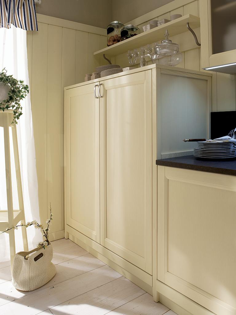 Base con struttura in multistrato spessore 18 mm con profondità 582 mm, con anta in legno con telaio in abete massello e pannello in multistrato di pioppo impiallacciato abete spessore 22 mm, con vassoio protezione fondo in alluminio. L'elemento può essere destro os sinistro.