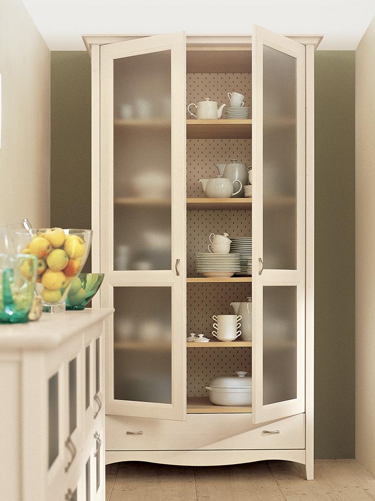 Cappa sagomata Amelia con fianchi e frontalino in tinta. Dispensa a due ante in vetro e credenza ad otto ante.