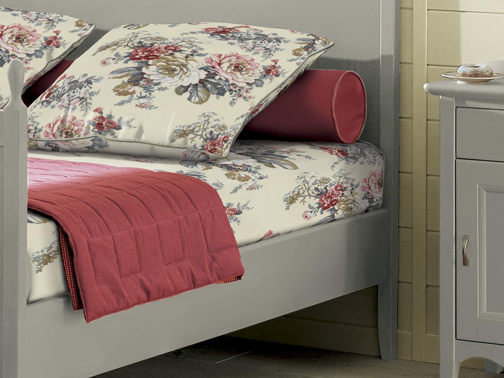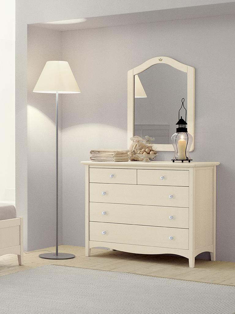 Ai piedi del letto non può mancare la cassapanca con coperchio apribile laccata panna su base liscia.