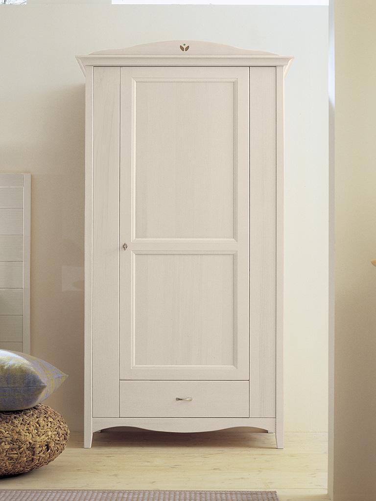 Struttura in pannello tamburato impiallaciato abete con schienale in particelle di legno spessore 8 mm, personlizzato con carta a piccoli fiori. Frontali ante e cassettucon telaio in legno massello e pannello in multistrato impiallacciato abete, spessore 22 mm. Struttura cassetti in multistrato di betulla spessore 15 mm con fondo in compensato, guide quadro ad estrazione totale. Profondità 630 mm (640 mm per armadio ad un'anta e 6 ante). Rifinibile con cimasa superiore. Attrezzato con un tubo appendiabiti, un ripiano inteno, specchio interno e cornice. Disponibile anche nellla versione senza cassetto.
