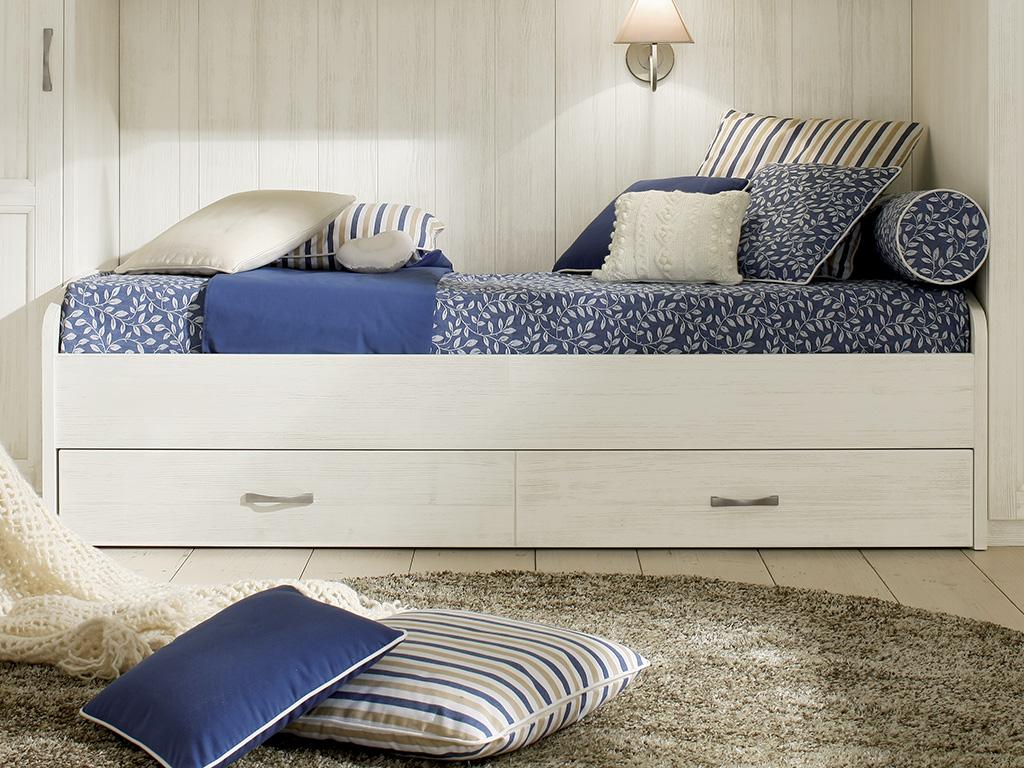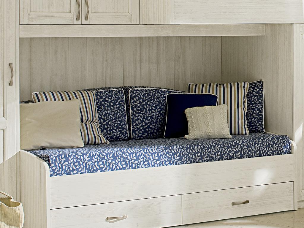 Nella parte inferiore: letto singolo Eco arricchito con cassettone estraibile per letto e coppia cuscini schienale in tessuto 44.
