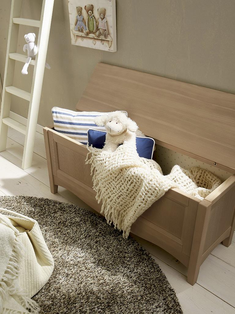 Pratica la Cassapanca Racconti con coperchio apribile per riporre coperte e cuscini, in finitura corda talcato legno spazzolato.