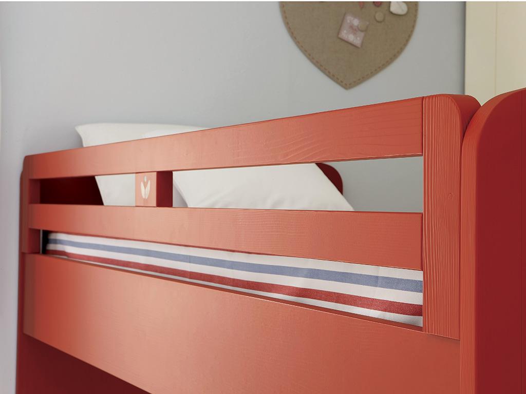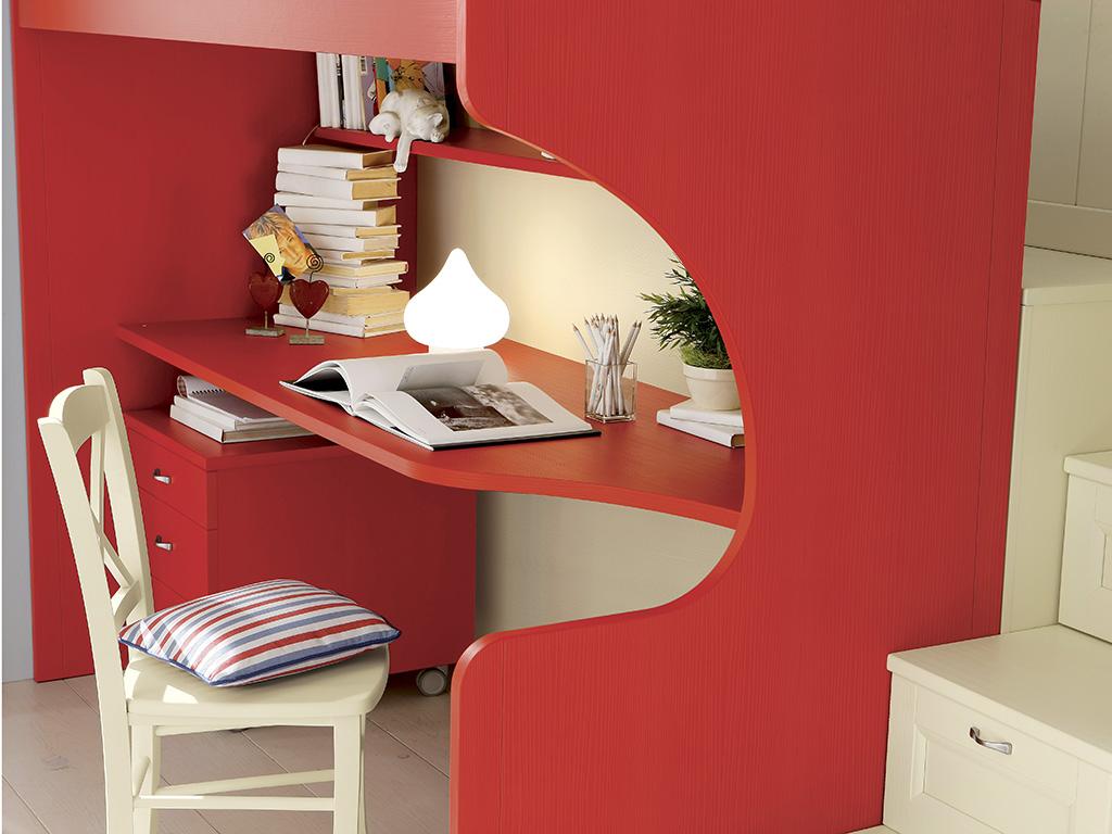 Rosso corallo su legno spazzolato ad imprimere la forza e la vitalità del letto a soppalco con scrittoio inferiore.