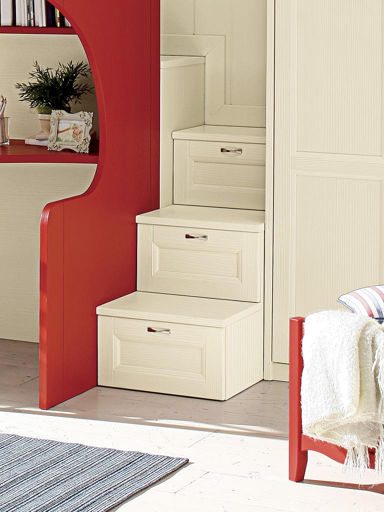 La scala di accesso al letto superiore è realizzata con cassetti travestiti da gradini ed il corridoio nasconde un pratico contenitore.